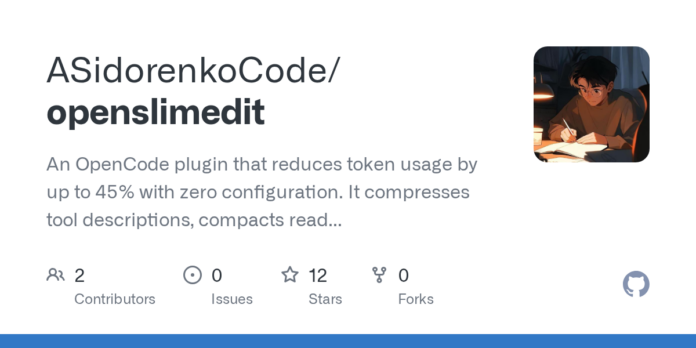 Introducing OpenSlimedit, an innovative OpenCode plugin that enhances your AI editing efficiency by reducing token usage by up to 45%—all without any configuration!