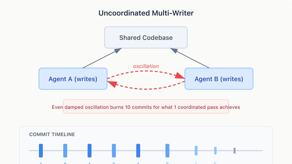 - Oscillation & Conflict: Two agents can undo each other’s work, leading to inefficiencies. A single writer can forestall this issue.