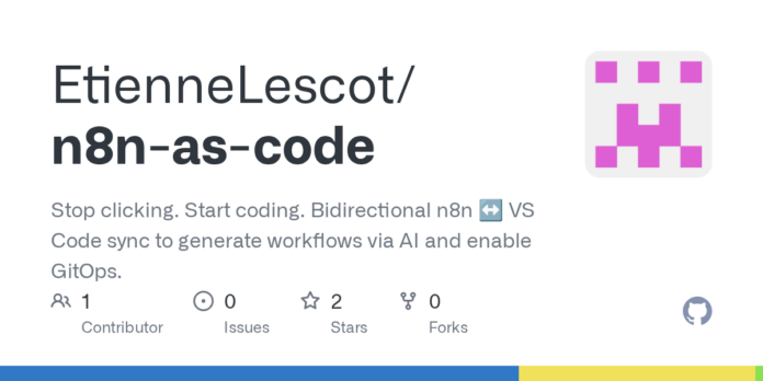 EtienneLescot/n8n-as-code: Streamline Workflow Creation with AI-Driven, Bidirectional n8n ↔️ VS Code Sync and GitOps Integration.