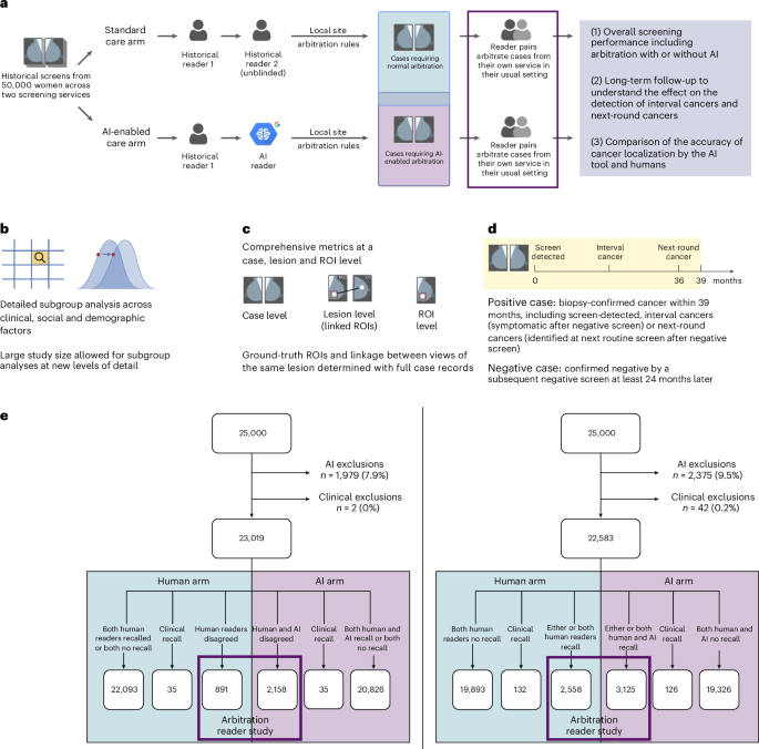 The Artificial Intelligence in Mammography Screening (AIMS) study, approved by the East Midlands Nottingham Research Ethics Committee and NHS England, aims to enhance breast cancer detection through AI. Funded by the National Institute for Health and Care Research (NIHR), the study analyzed mammography images from 50,000 women across two NHS Breast Screening Programme centers, assessing an AI tool developed by Google. The AI system determines mammogram results while marking suspicious regions of interest (ROIs). Rigorous case selection ensured high-quality ground truth data. The reader study compared the recall rate decisions of human radiologists with those influenced by AI, following structured arbitration protocols. The study also evaluated reader experiences and AI reliability, with robust statistical analyses to verify noninferiority in sensitivity and specificity. This comprehensive investigation contributes to the future of AI integration in breast screening, promising enhanced accuracy in early cancer detection.