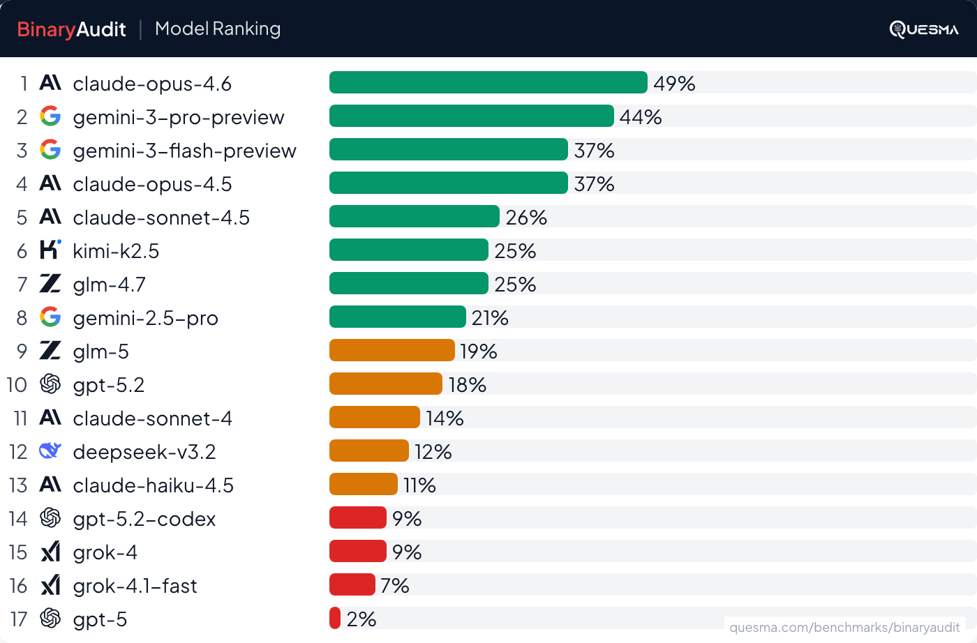 - Benchmark Results: Access the complete findings on our open-source project at QuesmaOrg/BinaryAudit.