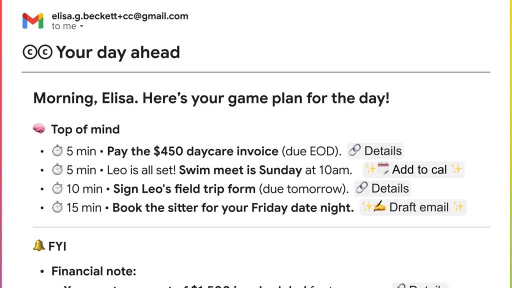 Google has introduced an experimental productivity assistant, CC, through Google Labs, powered by its Gemini models. This tool provides users with a daily briefing titled “Your Day Ahead,” consolidating information from their Gmail, Google Drive, and Google Calendar. Designed to enhance interaction, users can reply to the digest email to add tasks, search for files, save notes, or personalize the assistant’s preferences. This initiative aligns with major tech companies embedding AI assistants into productivity workflows. As email and calendar services become key testing grounds for AI, Google aims to promote user engagement and potentially drive paid subscriptions. Competing with startups like Mindy and platforms such as Read AI and Fireflies, CC leverages Google’s extensive user base, allowing effortless access to existing data without requiring third-party tools. Currently, CC is available for Google AI Pro and Ultra subscribers in the US and Canada and is not yet accessible to Workspace users.