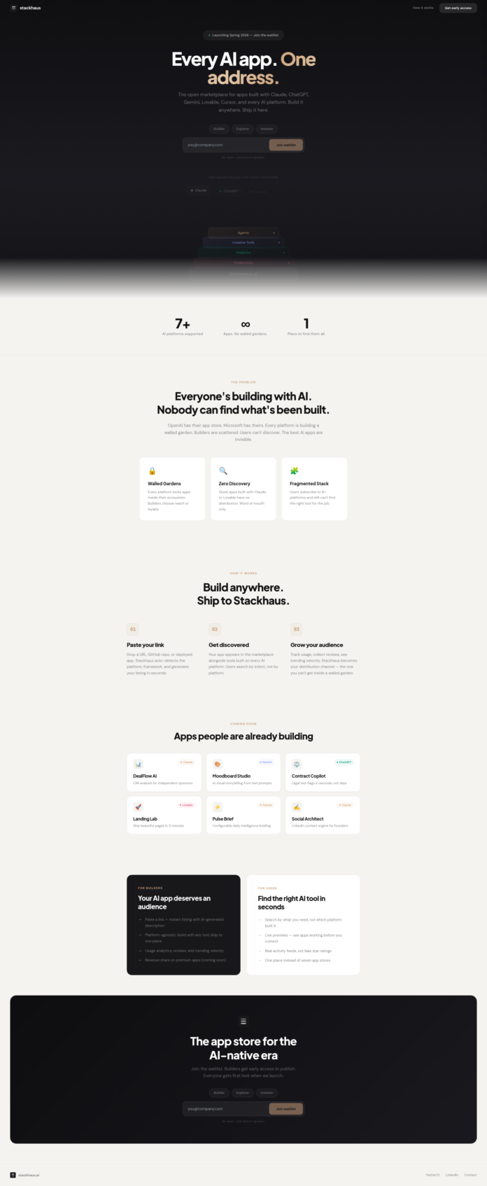 Today, my co-founder and I proudly announce the launch of Stackhaus, addressing a crucial gap in the AI landscape. While generative coding tools like ChatGPT are revolutionizing software development, the distribution of AI-generated apps has been lacking.