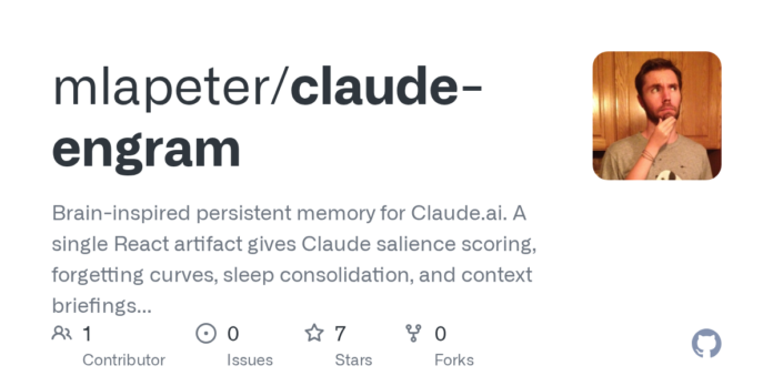 mlapeter/claude-engram: Brain-Inspired Persistent Memory for Claude.ai – A Comprehensive React Tool Offering Salience Scoring, Forgetting Curves, Sleep Consolidation, and Context Briefings Directly Within the Chat Interface – No API Key, Server, or Extension Required
