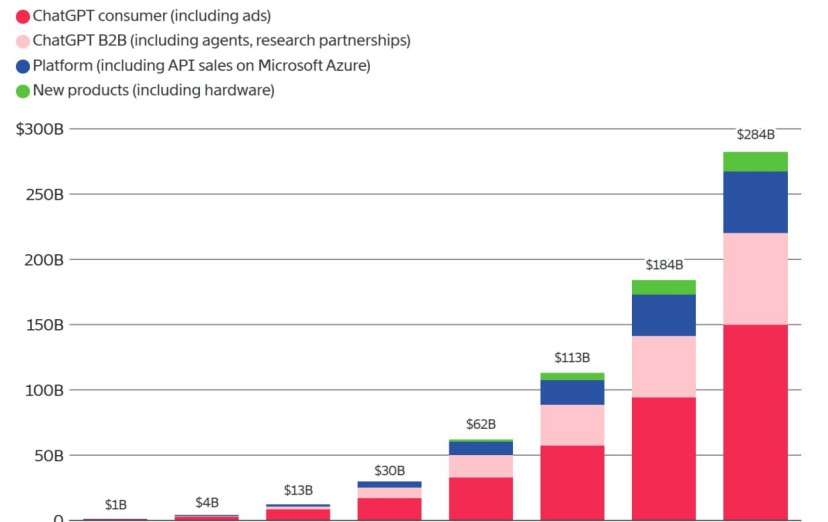 Leaked slides from OpenAI reveal ambitious financial projections ahead of a potential $1 trillion valuation in an upcoming investment round. The company has raised its five-year revenue forecast by 27%, predicting revenues could soar from $13.1 billion in 2025 to over $280 billion by 2030. This growth is fueled by demand for ChatGPT subscriptions, which could double consumer sales to $150 billion by 2030. However, a staggering cash burn of $665 billion is anticipated through 2030, driven by escalating compute costs—$25 billion in 2026 and $57 billion in 2027. OpenAI’s gross margin has decreased from 40% to 33%, yet positive cash flow is projected by 2030 amidst substantial cash reserves. User growth for ChatGPT has reached 910 million weekly active users, with expectations of reaching 2.75 billion by 2030. As AI investment heats up, the balance between soaring revenues and expenses remains critical for stakeholders.