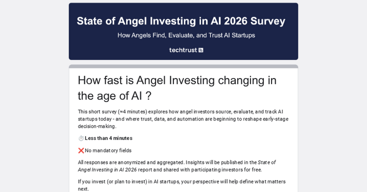 Join us in a brief 4-minute survey that dives into the evolving landscape of angel investing in AI startups. Your input will help shape the upcoming State of Angel Investing in AI 2026 report, providing valuable insights for investors and industry leaders alike.